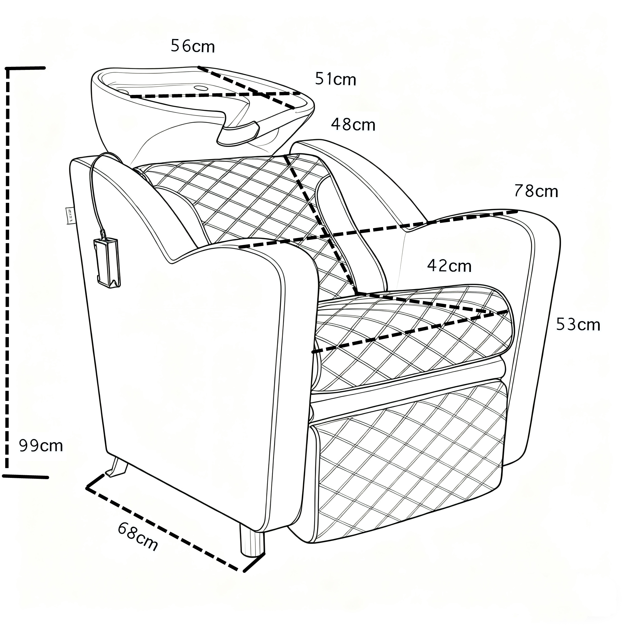 Lavatesta realizzato in multistrato rivestito in gomma piuma e skai. Vasca in ceramica basculante non inclusa di miscelatore e doccetta (è possibile scegliere gli accessori idraulici tra la nostra gamma), sotto vasca in vetroresina. Alza gambe elettrico con telecomando.