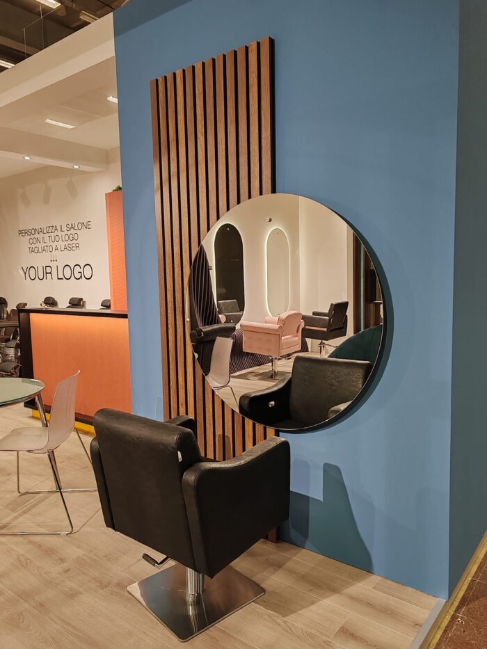 Lo specchio tondo, dotato di una retro-illuminazione led sul laterale, è posto centralmente su di un alto pannello dogato , realizzato in bilaminato di multistrato.